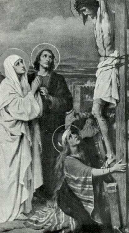 Look, devout soul, look to Calvary, whereon are raised two altars of sacrifice, one on the body of Jesus, the other on the heart of Mary. Sad is the sight of that dear Mother drowned in a sea of woe, seeing her beloved Son, part of her very self, cruelly nailed to the shameful tree of the cross. How every blow of the hammer, how every stripe which fell on the Saviour's form, fell also on the disconsolate spirit of the Virgin. As she stood at the foot of the cross, pierced by the sword of sorrow, she turned her eyes on Him, until she knew that He lived no longer and had resigned His spirit to His Eternal Father. O Mother of Sorrows,* who wouldst not leave Calvary until thou hadst drunk the last drop of the chalice of thy woe,* how great is my confusion of face,* that I so often refuse to take up my cross,* and in all ways endeavor to avoid those slight sufferings* which the Lord, for my good, is pleased to send upon me.* Obtain for me, I pray thee,* that I may see clearly the value of suffering,* and may be enabled, if not to cry with St. Francis Xavier,* "More to suffer, my God! ah, more!"* at least to bear meekly all my crosses and trials.* Amen. |