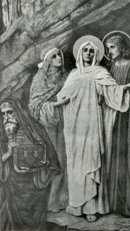 On June 28, 1820, the feast of Saints Peter and Paul, Elizabeth beheld the Prince of the Apostles descending from Heaven in pontifical vestments and escorted by a legion of angels. With his crosier, St. Peter drew an immense cross upon the Earth; on each of its ends verdant trees appeared enveloped in brilliant light. Here the godly - religious and lay alike - found refuge from the torment.