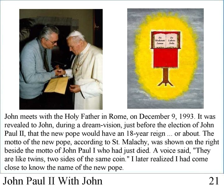 From the start this collaborator was told by Heaven to leave his home, in Cincinnati, OH, contaminated by his daughter steeped in pentecostalism, who came to own her father's house, and seek refuge as far as possible, elsewhere, in order to be free from any ill-effects. But he stubbornly refused, thus giving free entry to the Evil One to introduce his falsehood in the answers that Heaven was giving him. This falsehood was so wily that it took the intervention of The Father in conversation with Moses, and numerous other dream-visions to John, in order to alert him, showing the collaborator in quicksand with the extreme danger of being completely sucked in also.