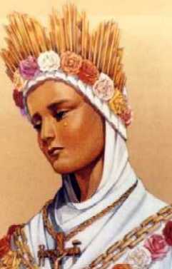 June 17, 2001 - On this feast of The Blessed Sacrament or Corpus Christi, during the rosary at Marie DeGrechie's house, again during the Salve Regina, flashed before my closed eyes the life-size, rugged outdoor cement statue of Our Lady dressed in a long green mantle, the same green as shown to me by St. Joseph in the sun, on January 21, 1989 (cf. Section VIII). Our Lady was wearing a massive golden crown which covered part of her forehead.