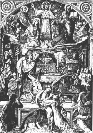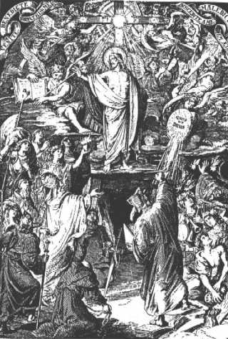 After the purification described above had been accomplished, Elizabeth saw Saint Peter descending from Heaven on a majestic pontifical throne. He was followed by Saint Paul, who "traversed the world to imprison those malignant infernal spirits and bring them before the holy Apostle Saint Peter who, with authority, confined them to the dark netherworld from which they had been released. Then a beautiful radiance shone above the Earth, announcing the reconciliation of God and man"13 and the remnant of faithful Catholics were led from their place of refuge to the throne of Saint Peter.