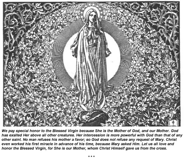 Look, devout soul, look to Calvary, whereon are raised two altars of sacrifice, one on the body of Jesus, the other on the heart of Mary. Sad is the sight of that dear Mother drowned in a sea of woe, seeing her beloved Son, part of her very self, cruelly nailed to the shameful tree of the cross. How every blow of the hammer, how every stripe which fell on the Saviour's form, fell also on the disconsolate spirit of the Virgin. As she stood at the foot of the cross, pierced by the sword of sorrow, she turned her eyes on Him, until she knew that He lived no longer and had resigned His spirit to His Eternal Father. O Mother of Sorrows,* who wouldst not leave Calvary until thou hadst drunk the last drop of the chalice of thy woe,* how great is my confusion of face,* that I so often refuse to take up my cross,* and in all ways endeavor to avoid those slight sufferings* which the Lord, for my good, is pleased to send upon me.* Obtain for me, I pray thee,* that I may see clearly the value of suffering,* and may be enabled, if not to cry with St. Francis Xavier,* "More to suffer, my God! ah, more!"* at least to bear meekly all my crosses and trials.* Amen. |