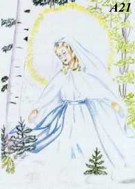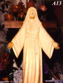 Explication: (A13) C'est la statue sculptée de La Dame de tous les Peuples5 qui pleura au Canada à diverses reprises en 1983 et 1984, ainsi qu'en 1985 (A14), cette fois-ci peinte selon le grand tableau à Amsterdam, Hollande, où eurent lieu les apparitions entre 1945 et 1959. Une autre statue sculptée de La Dame de tous les Peuples pleurera aussi à Akita, au Japon, de 1975 à 1981.