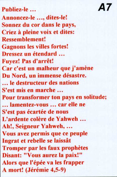 Ce sera soudain paraît-il, au moment où le monde criera paix et donc ne s'y attendra pas. Donc lisez bien les lignes du prophète Jérémie (A7), et sachez quel est ce malheur que Dieu amène du Nord! ce peuple dont Dieu va se servir comme d'une verge de fer pour punir les Nations coupables. Le grand coup se prépare, et seule la prière peut atténuer le châtiment, si elle ne peut plus l'écarter. La Ste Vierge, comme Elle l'a dit à plusieurs instruments, laisse maintenant tomber le bras de Son Fils. C'est l'heure! Le Ciel a parlé; des statues, des icônes, des images, des photos ont même pleuré à travers le monde, mais le monde est demeuré sourd et aveugle.