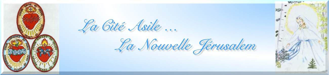 Qu'est-ce donc que La Cité Asile? Pour en jauger tout le mystère et la grandeur de ce plan de Dieu il faut considérer, d'un côté, tous les signes du Ciel qui accompagnent sa fondation depuis les années 80 et, de l'autre, les assauts de l'Enfer pour discréditer ce plan de Dieu à la conjoncture de deux époques, ce plan pour l'entrée de l'humanité dans l'Ere nouvelle, l'âge du Saint Esprit qui doit durer mille ans selon les Saintes Ecritures. Dans l'histoire de l'humanité il y eut l'âge du Père de 4,000 ans, depuis la chute du premier homme jusqu'à la venue du Fils, qui ouvrit l'ère de la rédemption sur une période de 2,000 ans, qui doit maintenant s'ouvrir sur l'ère du Saint Esprit, le dernier mille ans avant la Grande Venue du Christ et le jugement final de l'humanité. Or il faut dire de suite que la conjoncture des temps où nous sommes présentement sera marquée par la Venue Intermédiaire du Christ pour le rétablissement de l'Eglise en sa nouvelle forme sous la gouverne de la Vierge Marie résidant en la nouvelle Jérusalem avec Schilôh, le représentant du Christ qui règnera auprès de la Vierge pour former la théocratie, la forme de gouvernement pour l'Ère nouvelle.