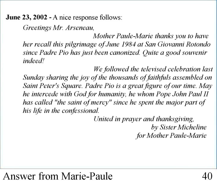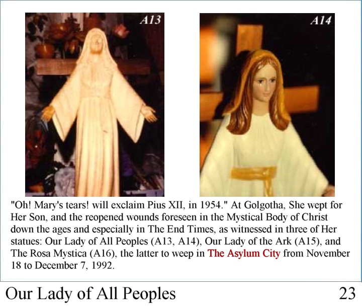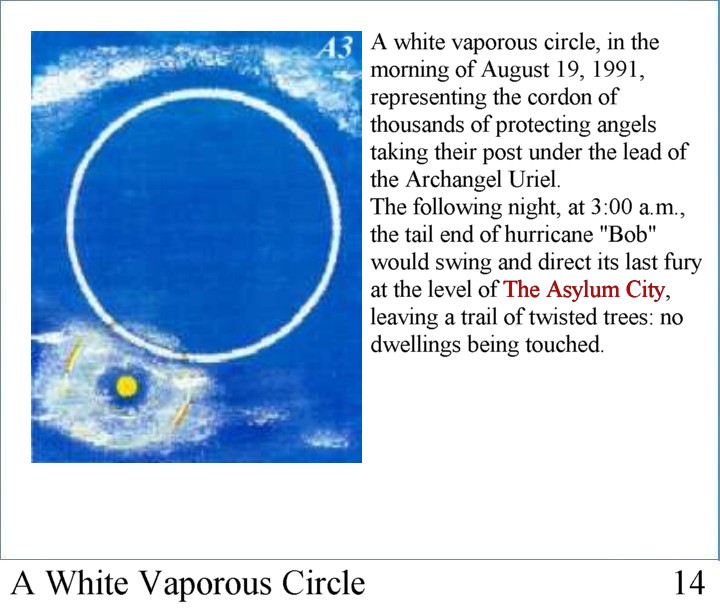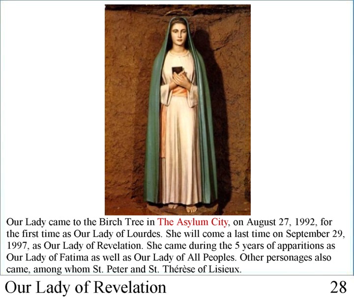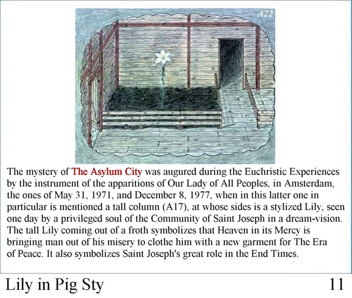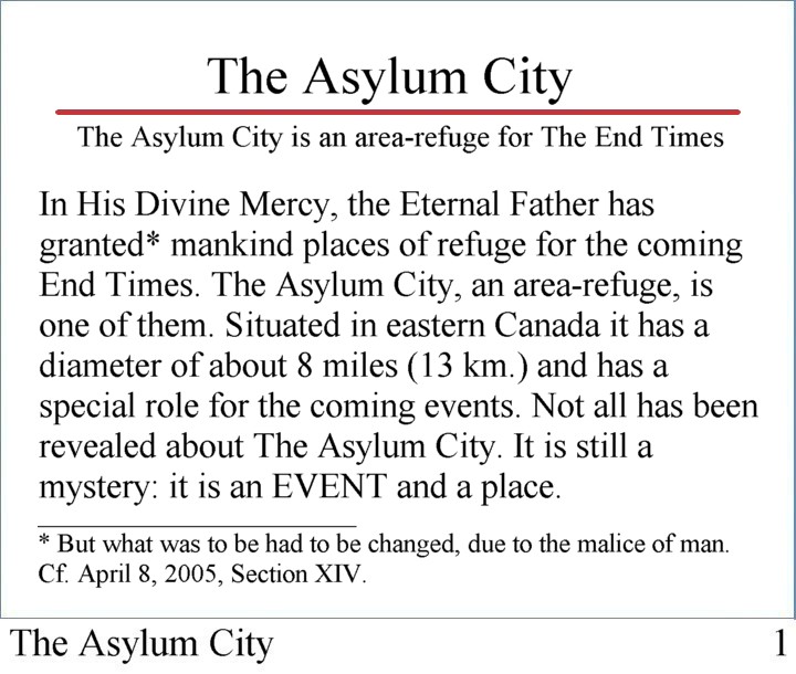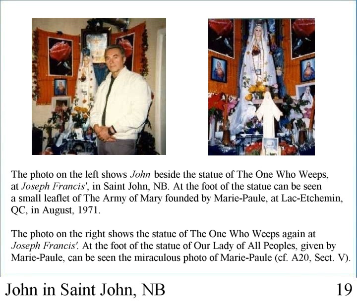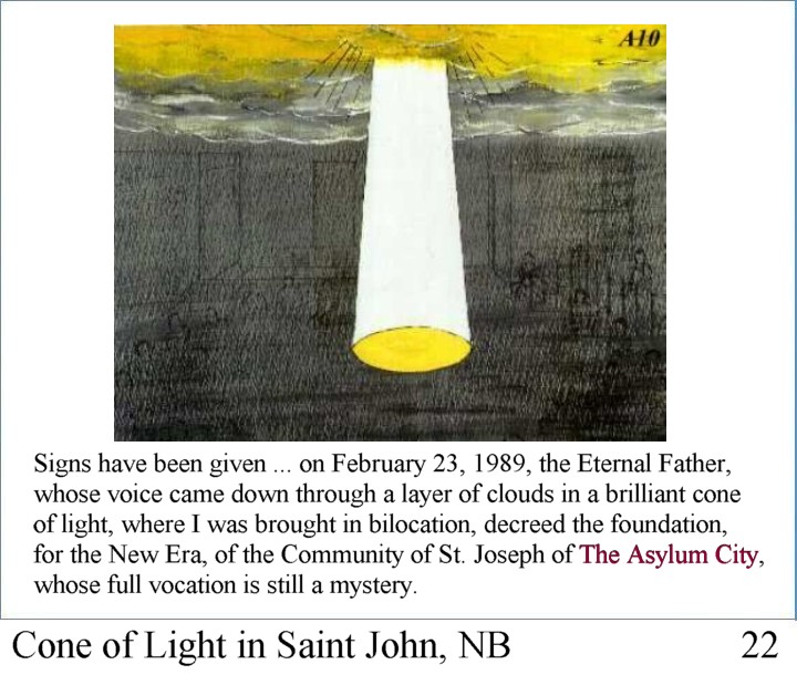 And although advised of this intervention by The Father, that collaborator still insisted to express his righteousness, even to the extent of saying he could not make a mistake as "he was a direct channel of wisdom" between The Father and John, guardian of Mary, and the instrument chosen for the establishment of The Asylum City and the Community of St. Joseph, called to work in unity with Marie-Paule, the servant of Our Lady of All Peoples, in Lac-Etchemin, QC.